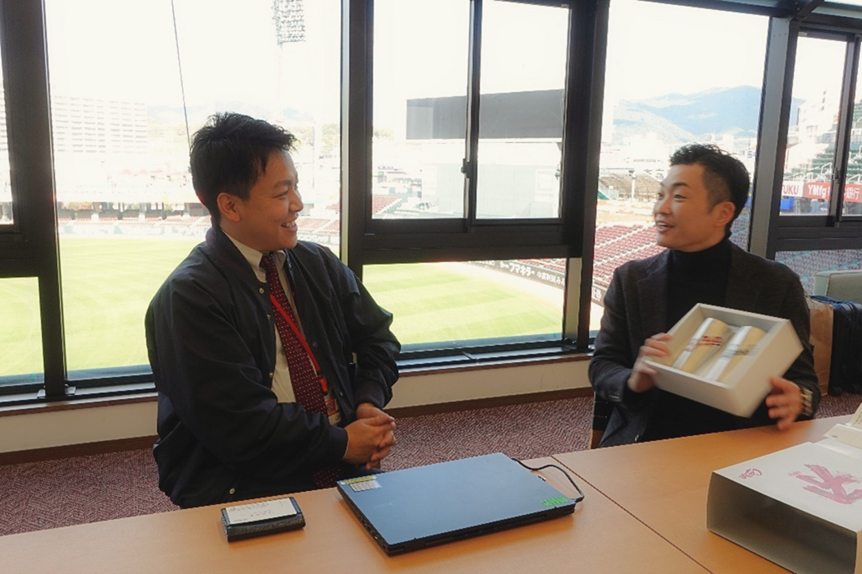 また、営業担当の長谷川さん以外の方とも直接コミュニケーションが取れる点も好印象です。例えば他社のデザイナーとはお会いしたことがないのですが、オンワードさんのデザイナーの方は長谷川さんと一緒にカープの球場(マツダ スタジアム)まで一緒に来られたことがあり、直接お会いすることでカープの想いを伝えることができました。